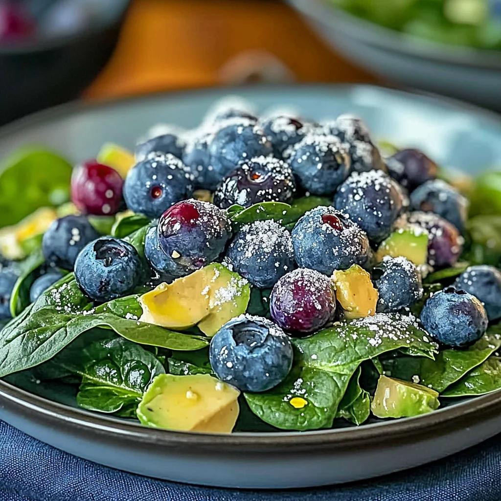 - In a large mixing bowl, combine the spinach, blueberries, feta cheese, red onion, and walnuts.