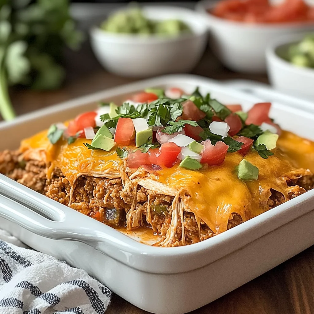 - In a baking dish, layer half of the tortilla strips, followed by half of the chicken mixture, and half of the cheese. Repeat the layers.