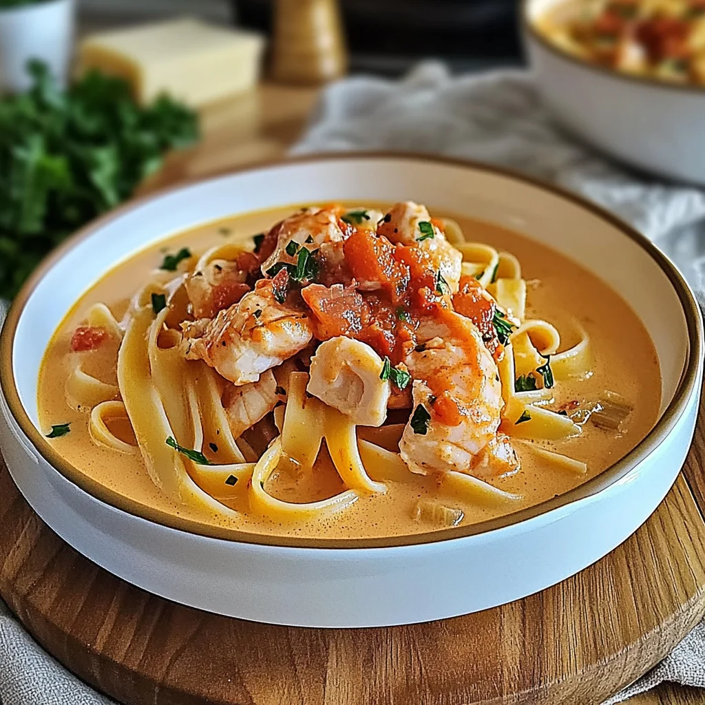 - Toss the cooked fettuccine in the lobster bisque sauce until well coated. Serve immediately, garnished with fresh parsley.