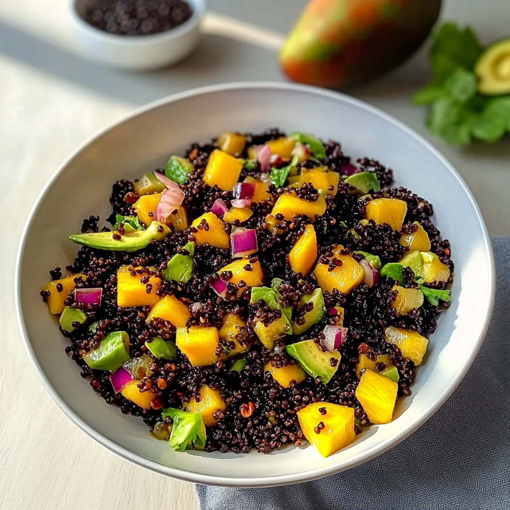 - In a large mixing bowl, combine the cooked black rice, diced mango, avocado, cherry tomatoes, red bell pepper, red onion, and cilantro.