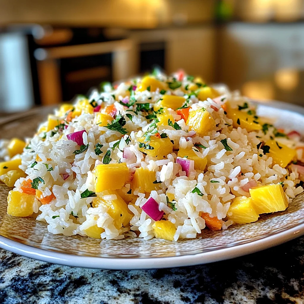 - In a large mixing bowl, combine the cooked rice, pineapple chunks, mango chunks, red bell pepper, red onion, and cilantro.