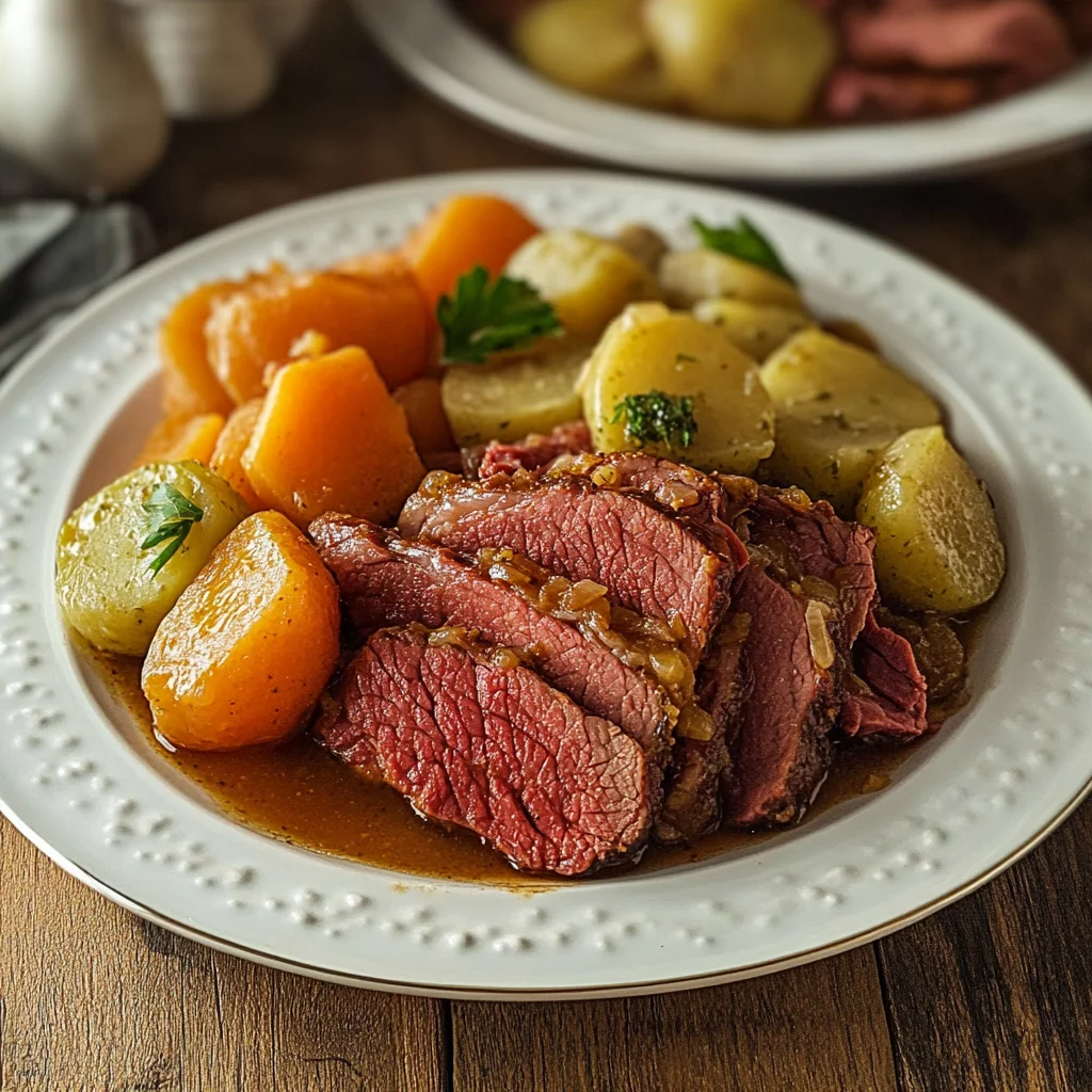 - Remove the corned beef from the slow cooker and let it rest for 10 minutes before slicing.